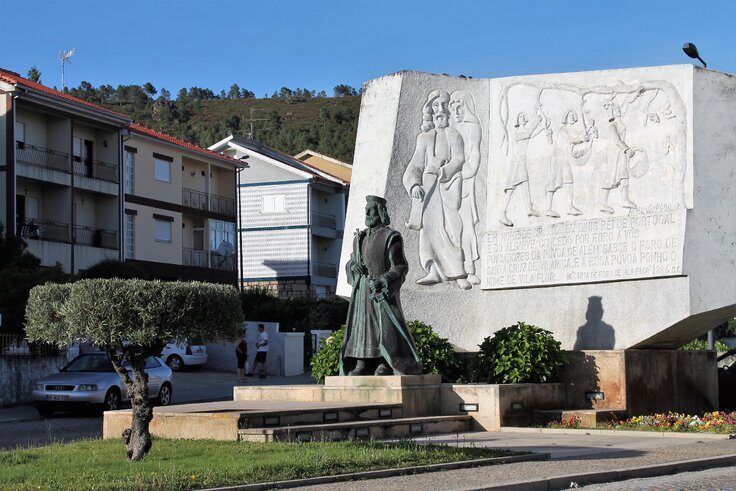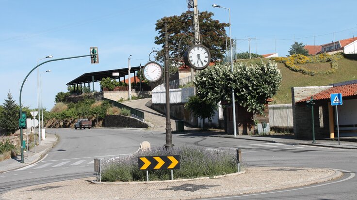 Circundar a rotunda e sair na via sinalizada com as placas indicativas Vila Flor Zona Histórica, Piscinas, Parque de Campismo e Estádio até encontrar a Rotunda dos Vasos