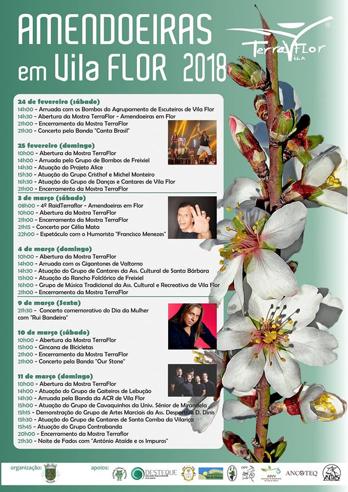 O Município de Vila Flor vai organizar, à semelhança dos anos anteriores, a Mostra TerraFlor/Amendoeiras em Flor 2018. Certos da importância desta iniciativa para os vários sectores da economia concelhia, divulgamos e convidamos os interessados a visitar este evento, que irá decorrer nos dias 24 e 25 de Fevereiro e 3, 4, 9, 10 e 11 de Março.