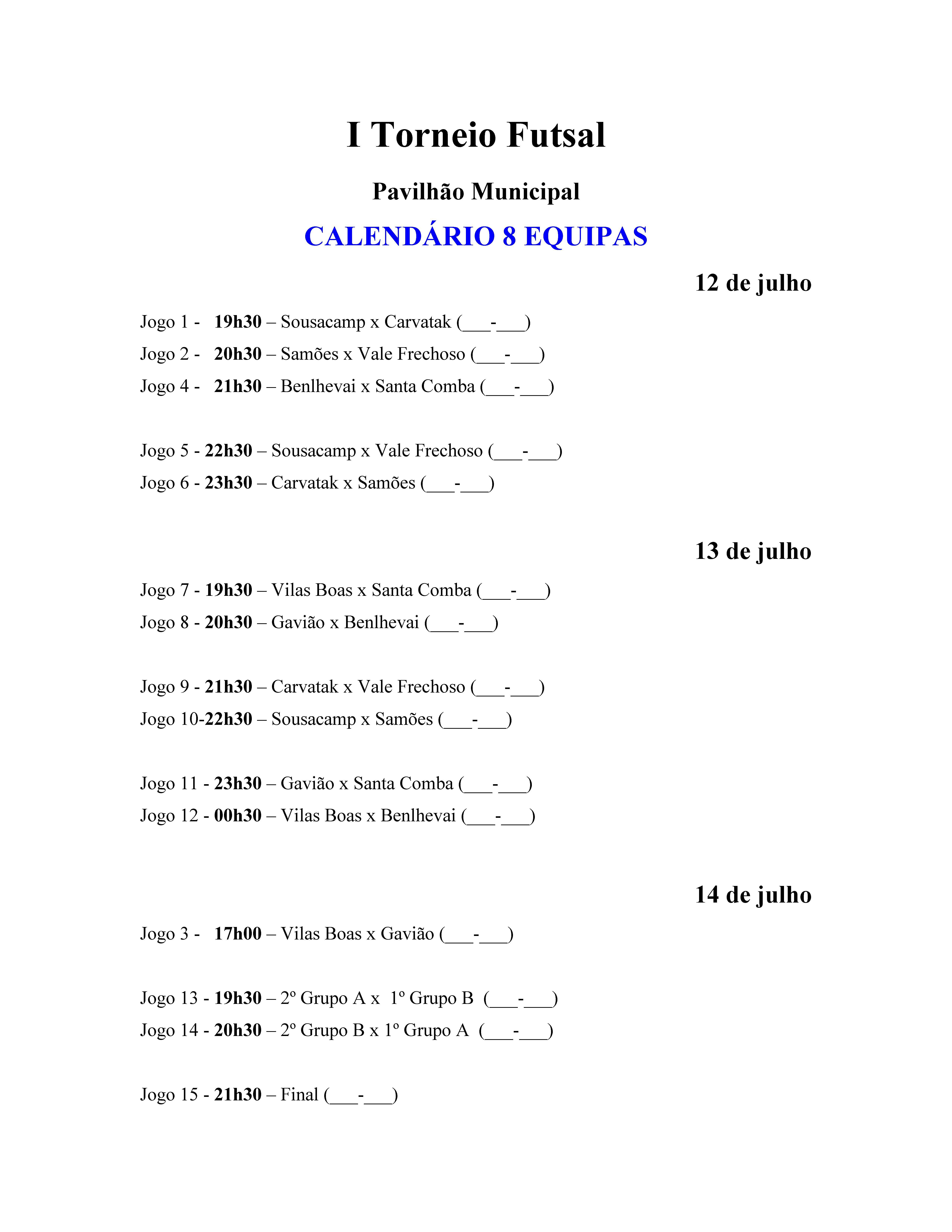 Já se encontra disponível o calendário do I Torneio de Futsal do Município de Vila Flor, que decorrerá nos dias 12, 13, e 14 de julho. Esta edição contará com 8 equipas provenientes de todo o Concelho.
