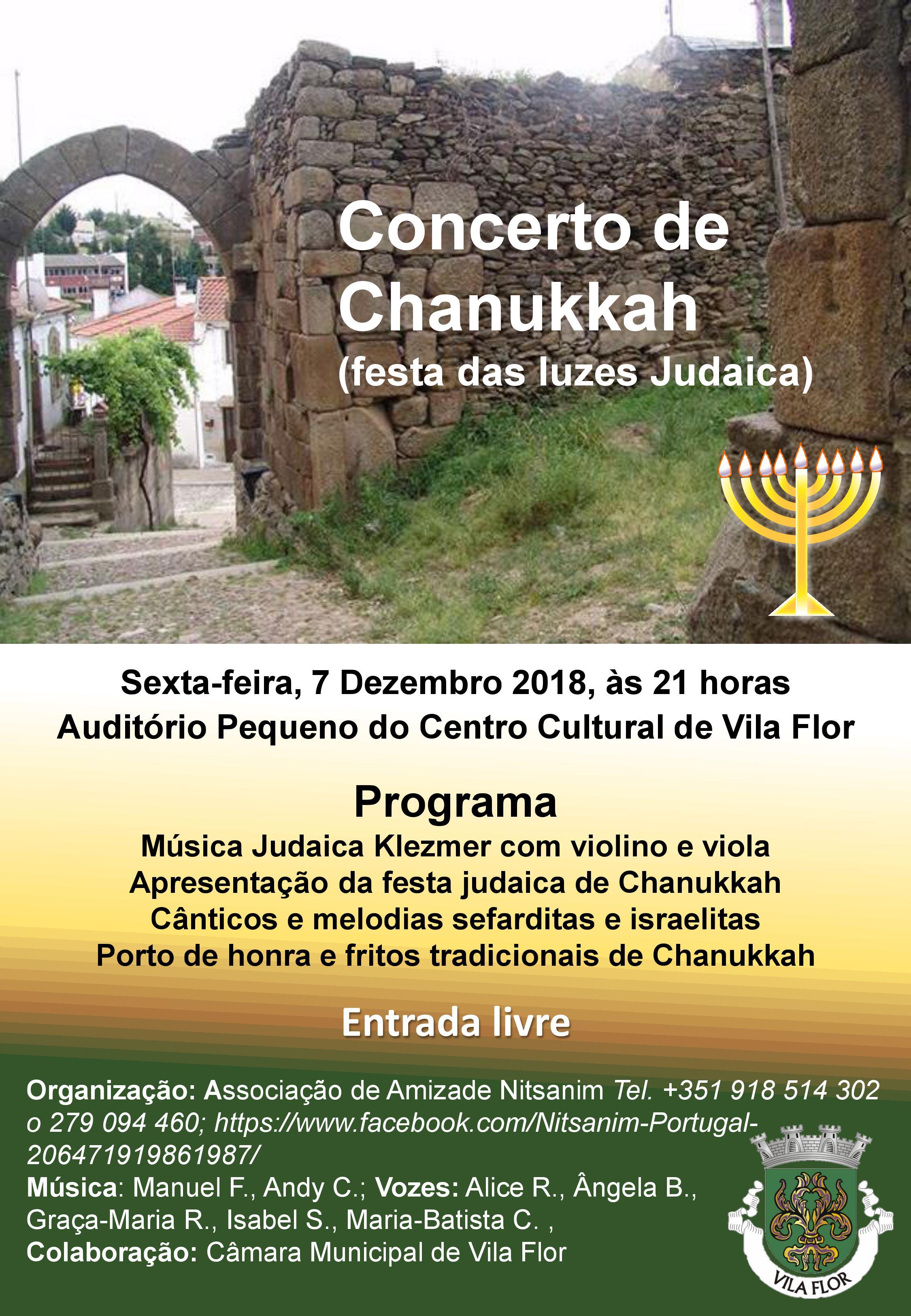 A Festa das luzes judaica (Chanukkah) é organizada pela Associação Nitsanim Portugal que tem por objetivo dar a conhecer ao público a cultura e a música judaicas, cânticos e melodias sefarditas e israelitas e ainda dar a conhecer alguns aspetos da sua gastronomia. Este concerto, a realizar na Sexta feira, dia 7 de Dezembro, no auditório pequeno do Centro Cultural de Vila Flor, é apoiado pelo Município de Vila Flor e tem entrada livre/gratuita.