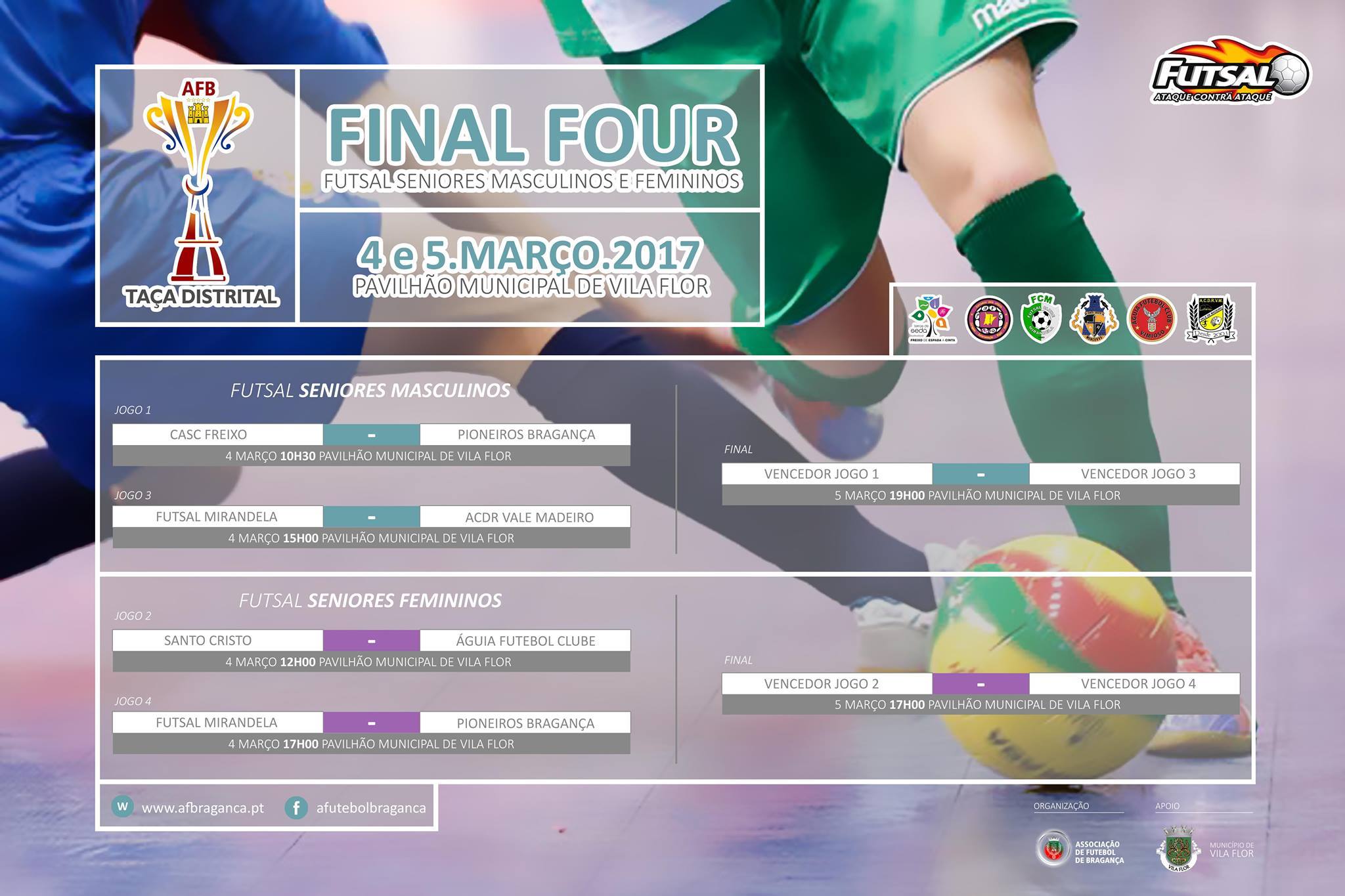 Nos dias 4 e 5 de Março, no Pavilhão Municipal de Vila Flor, irá decorrer a FINAL FOUR (Taça Distrital Masculina e Feminina), atividade resultante de uma Parceria entre a Câmara Municipal de Vila Flor e a Associação de Futebol de Bragança.
