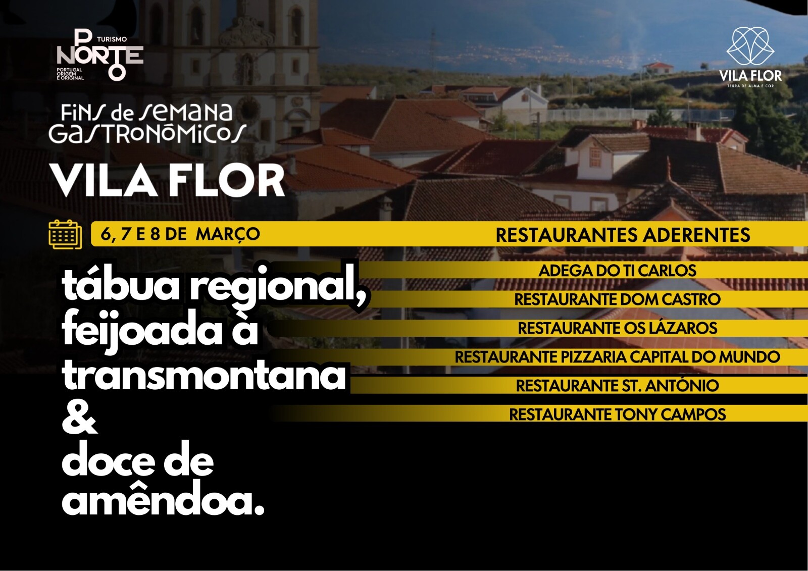 Numa ação promocional que visa a oferta gastronómica de qualidade no território e ao mesmo tempo a promoção e a dinamização do tecido económico durante a época de inverno, vem aí a II Edição dos Fins de Semana Gastronómicos, com selo do Turismo Porto e Norte e colaboração do Município, este ano com 6 restaurantes aderentes e com uma ementa que "não vai querer perder nem a feijões": Feijoada à transmontana, depois da tábua de produtos locais, onde não pode faltar o pão e o afamado azeite, e doce de amêndoa para terminar a refeição sob a temática do produto da época, ementa acompanhada de um bom vinho da terra.