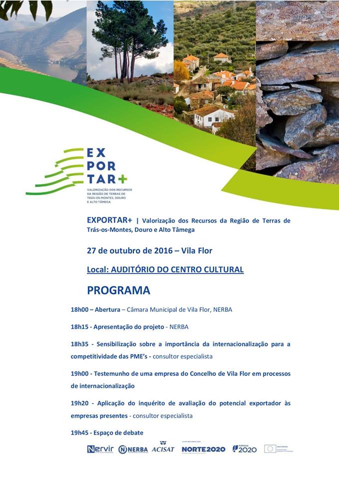 Dia 27 de outubro pelas 18h, irá decorrer no Auditório do Centro Cultural de Vila Flor um seminário intitulado Projeto EXPORTAR+ | Valorização dos Recursos da Região de Terras de Trás-os-Montes, Douro e Alto Tâmega, desenvolvido no âmbito do Programa Operacional Regional do Norte 2014-2020 (PO Norte 2020), na tipologia “Internacionalização".