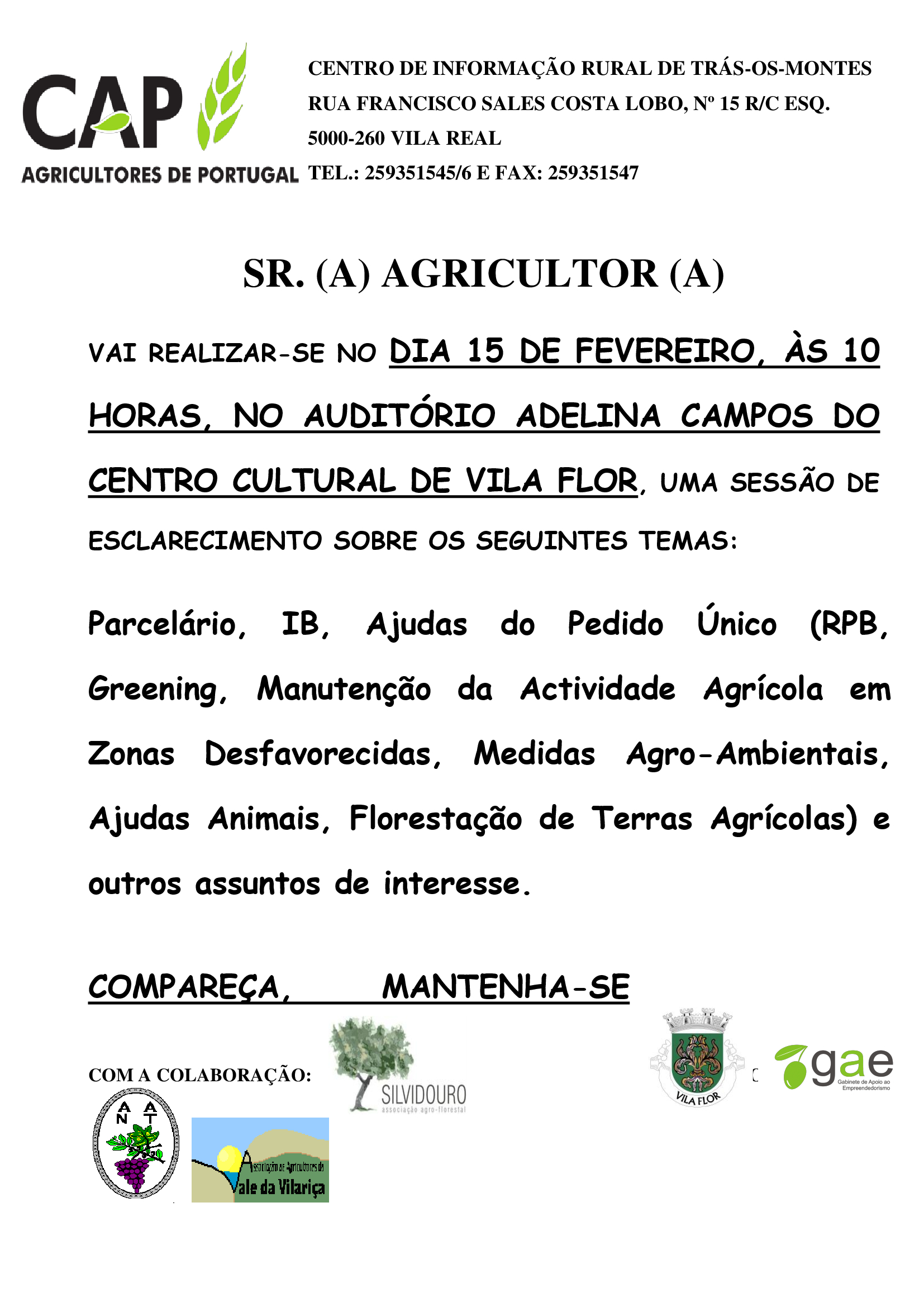 O Município informa aos agricultores que a sessão de esclarecimento da CAP terá lugar sexta-feira pelas 10h, no pequeno auditório do centro cultural.
