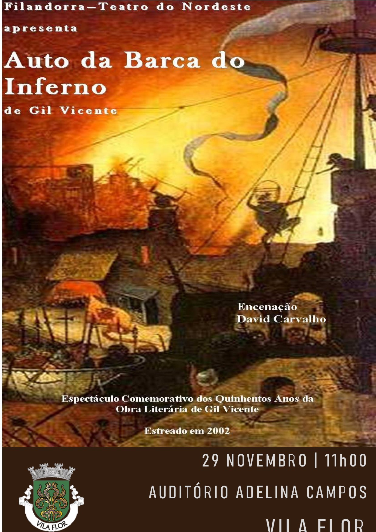 Dia 29 de Novembro, pelas 11 horas, o Auditório Adelina Campos irá receber a Peça de Teatro "Auto da Barca do Inferno", com encenação de David Carvalho, da Compª de Teatro Filandorra, espetáculo comemorativo dos 500 anos da obra literária de Gil Vicente.