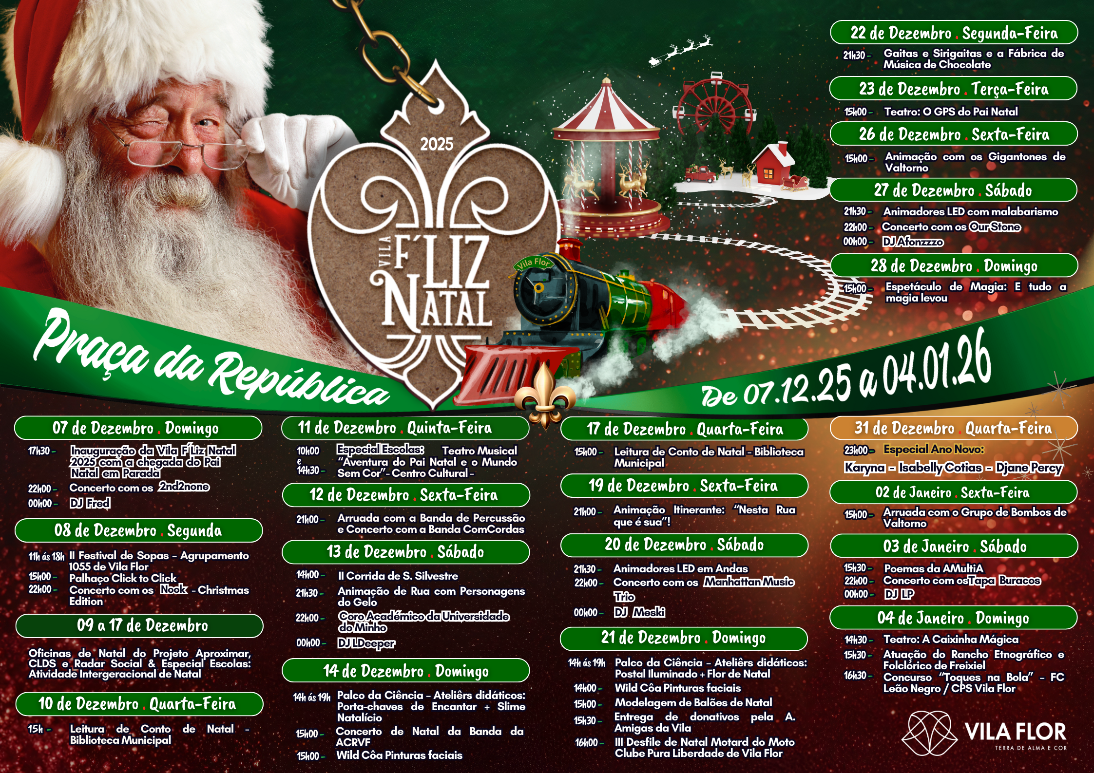 De 7 de dezembro a 4 de janeiro, Vila Flor enche-se de luz, vida e muitas surpresas para todas as idades. Deixe-se envolver por um ambiente acolhedor e cheio de espírito natalício, com diversão infantil , Mercadinho de Natal , a Casa do Pai Natal, ateliers e atividades infantis , concertos e música ao vivo , animações itinerantes, a participação das associações locais, dos projetos sociais e dos seniores, todos unidos para criar momentos inesquecíveis num programa festivo, envolvente e gratuito, pensado para que cada visita seja especial.