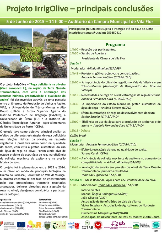 Realiza-se no próximo dia 5 de Junho, pelas 14 horas, no Centro Cultural, um Workshop de apresentação dos resultados do projeto “Rega deficitária na oliveira na região da Terra Quente Transmontana – IrrigOlive”.