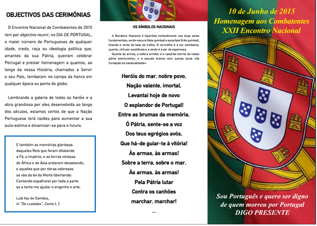 Por solicitação da Comissão do Executiva para a Homenagem Nacional aos Combatentes, divulga-se o programa do XXII Encontro dos Combatentes, a ter lugar no próximo dia 10 de Junho, Dia de Portugal, em Belém, Lisboa.