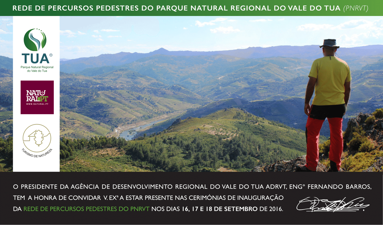 O Parque Natural Regional do Vale do Tua (PNRVT), inaugura nos próximos dias 16, 17 e 18 de Setembro, dois percursos pedestres. O PNRVT pretende com a criação desta rede de percursos pedestres alavancar uma nova oferta turística para o Vale do Tua, sendo este um dos seus principais objectivos.