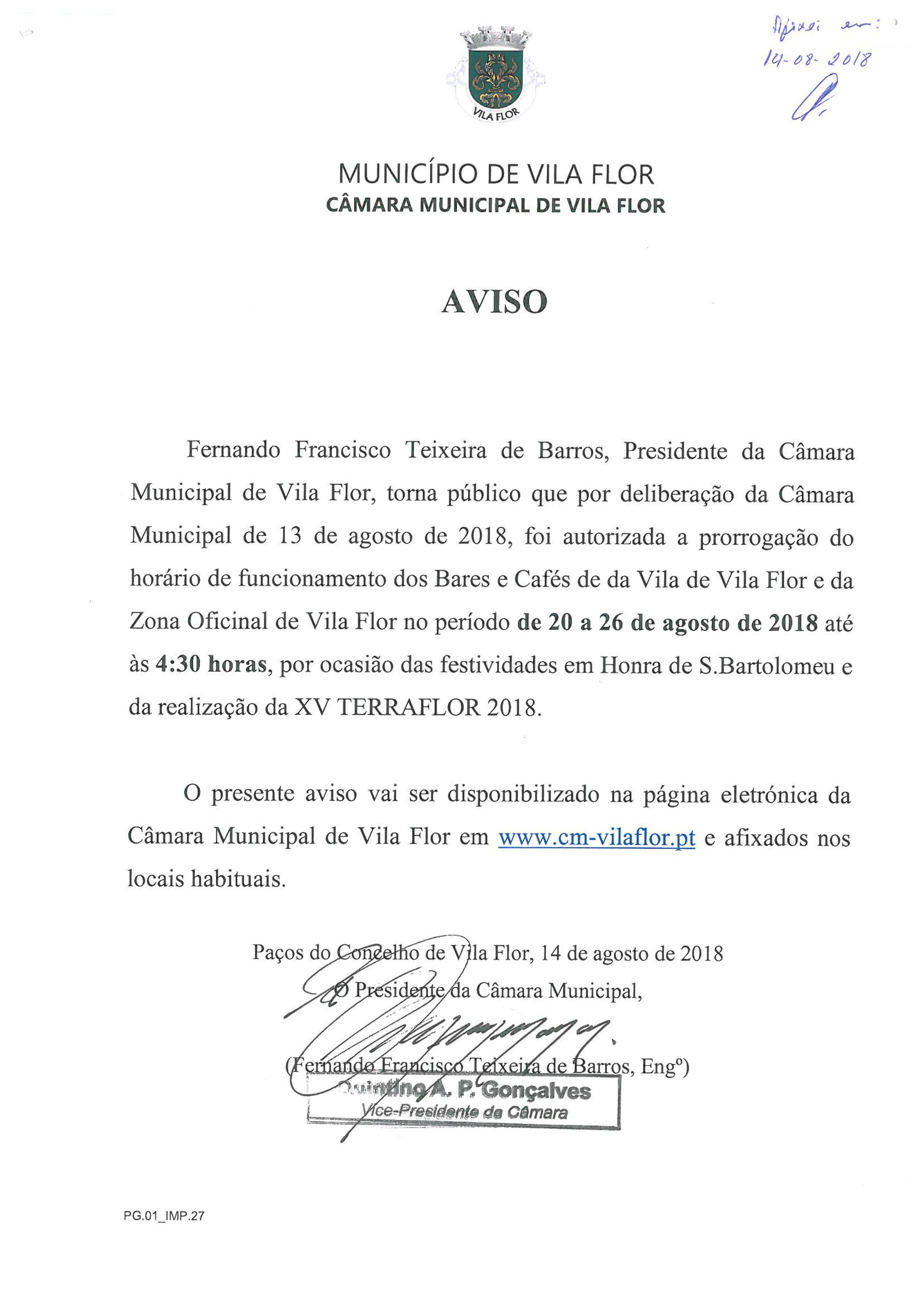 Prorrogação de horário de funcionamento dos bares e cafés da Vila e da Zona Oficinal de Vila Flor