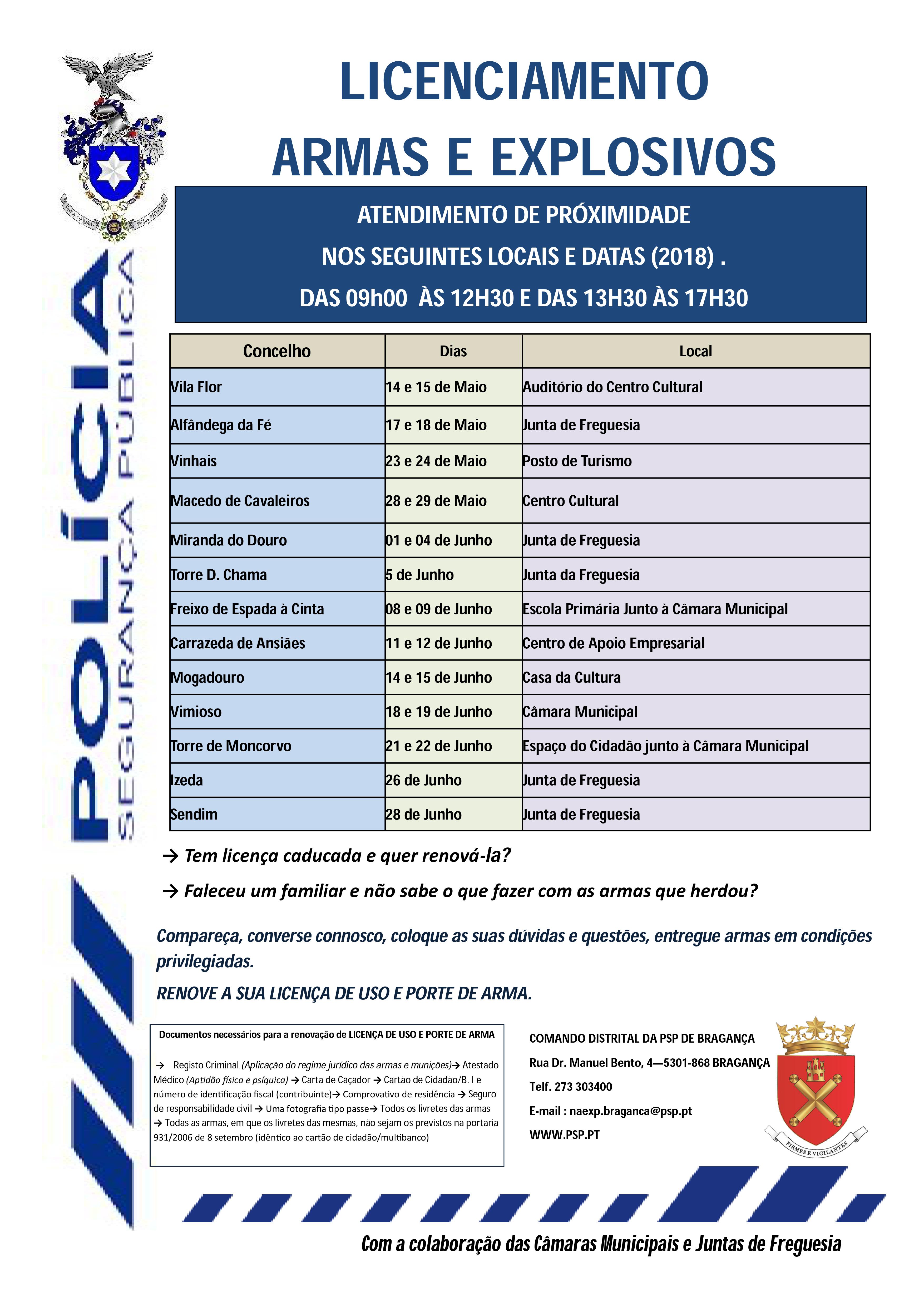 A Polícia de Segurança Pública, vai realizar nos próximos dias 14 e 15 de Maio, no Auditório do Centro Cultural, em Vila Flor, um atendimento de proximidade.