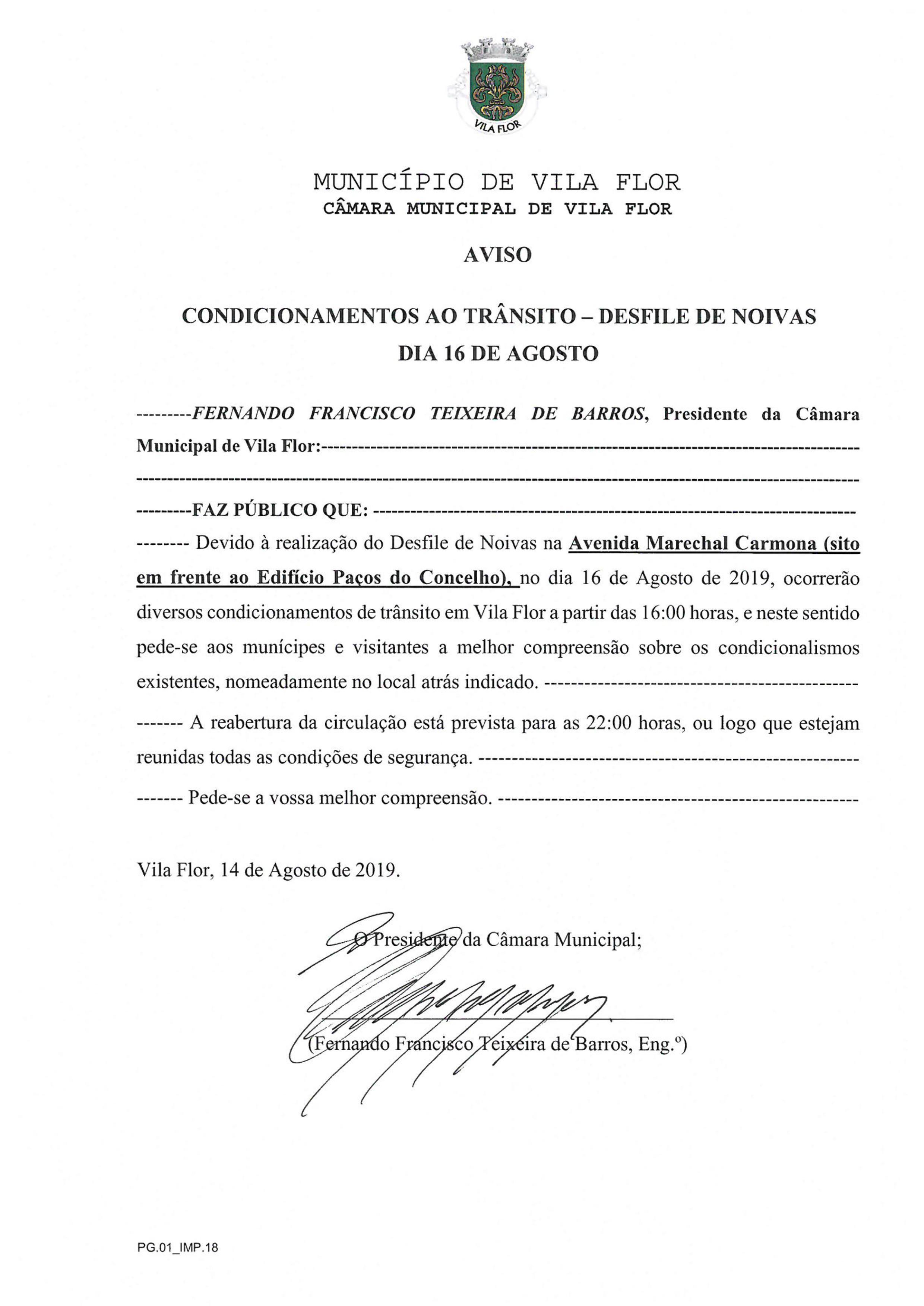 Aviso - Condicionamentos ao Trânsito - Desfile de Noivas