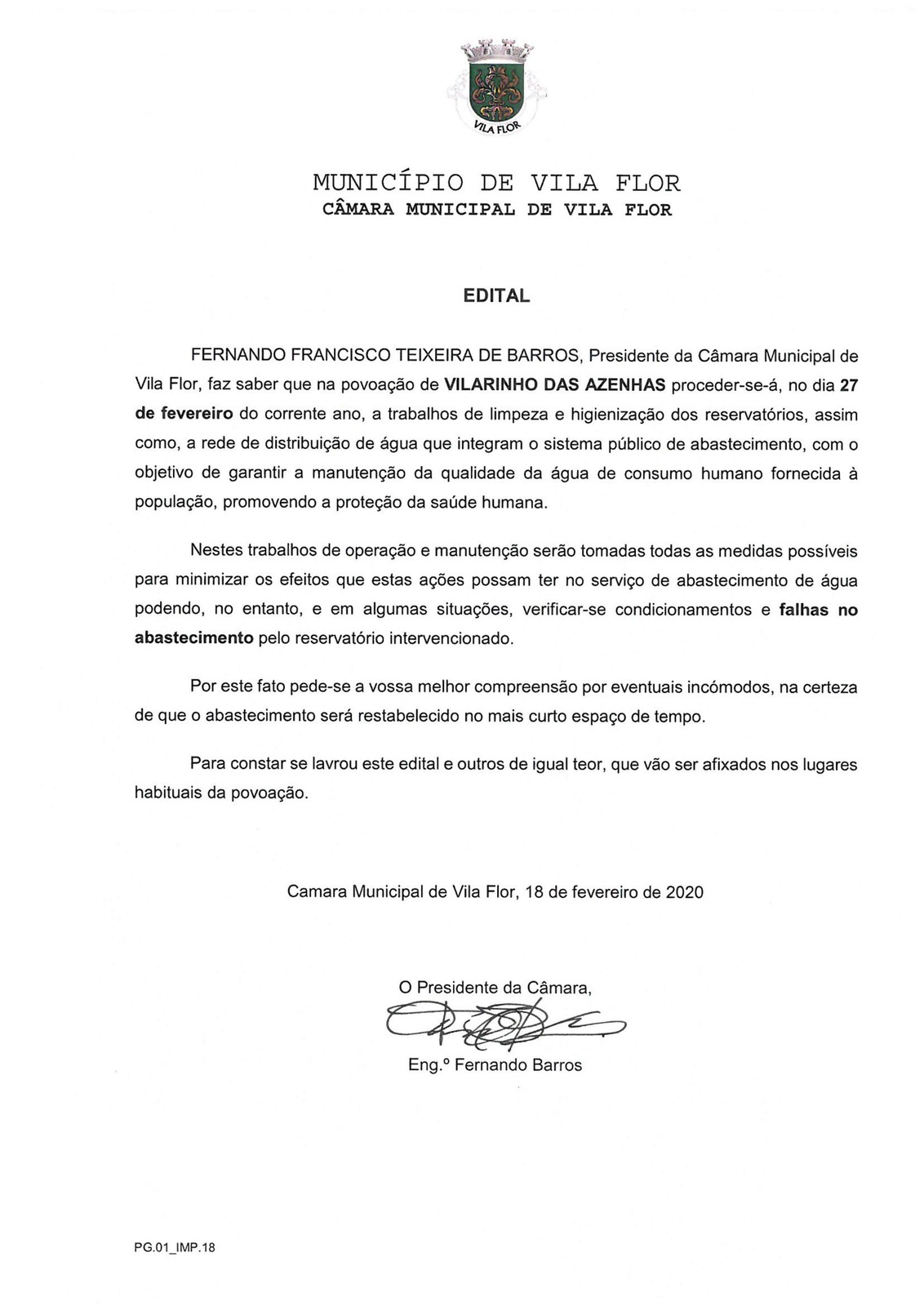 O Município informa que irá levar a cabo trabalhos de limpeza e higienização nos reservatórios de água da localidade de Vilarinho das Azenhas, que terão lugar no próximo dia 27 de fevereiro.