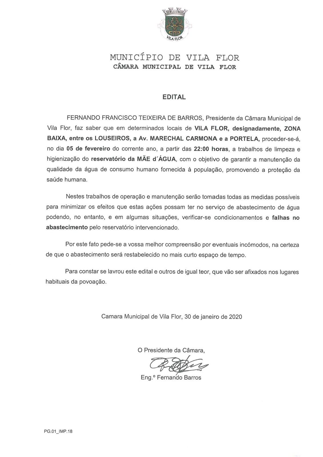 O Município de Vila Flor informa que, a partir das 22h do dia 5 de fevereiro, terão lugar trabalhos de higienização do reservatório da Mãe D'água com a finalidade de promover a qualidade da água para consumo humano, pelo que poderão existir algumas falhas no abastecimento até que a higianização fique concluída.