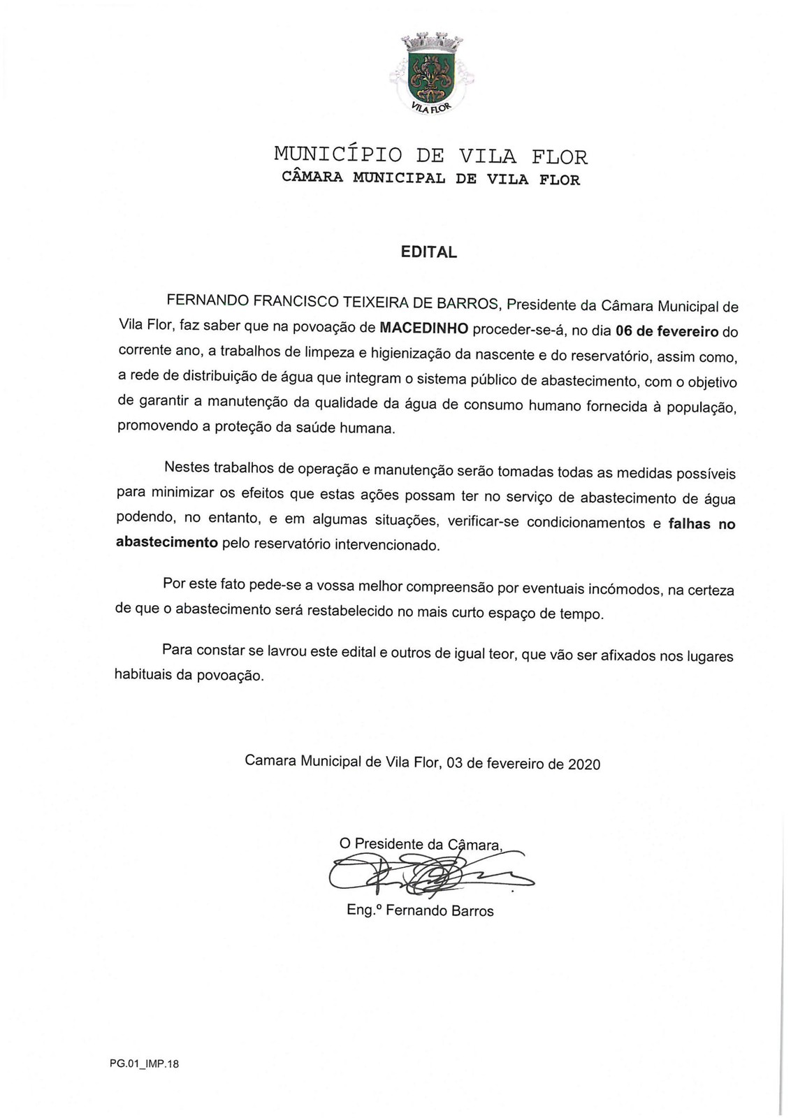 O Município informa que, em razão da realização de trabalhos de higienização da nascente e reservatório de água de Macedinho, no próximo dia 6 de fevereiro poderão ocorrer falhas no abastecimento à localidade mencionada.
