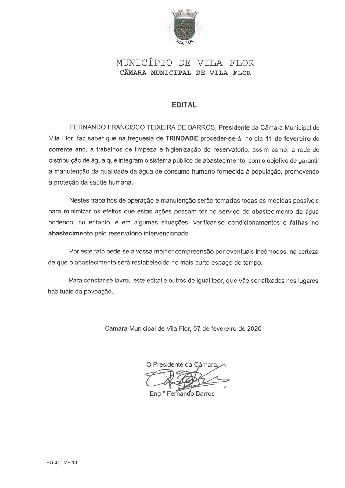 O Município informa que o reservatório de água da Trindade será submetido a trabalhos de limpeza e higienização no dia 11 de fevereiro, pelo que poderão ocorrer algumas falhas no abastecimento de água àquela população durante o dia mencionado.