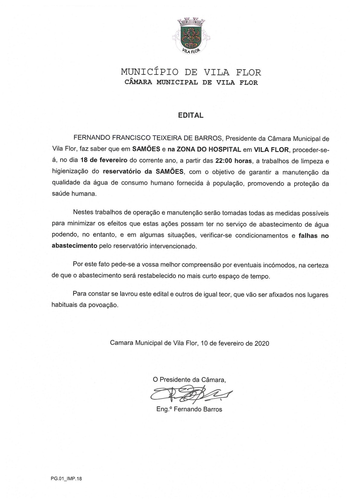 O Município informa que o reservatório de água de Samões será submetido, a partir das 22h do próximo dia 18 de fevereiro, a trabalhos de limpeza e higienização, o que poderá ocasionar falhas no abastecimento de água naquela localidade.