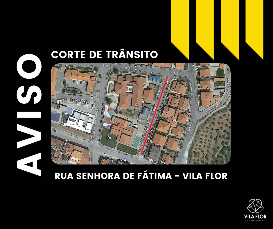 Em virtude da execução da empreitada de ampliação da rede de águas de Vila Flor, a rua será encerrada ao trânsito, durante os dias úteis a partir do dia 25 de setembro ao 6 de Outubro, das 08:00 horas até às 17:30 horas.