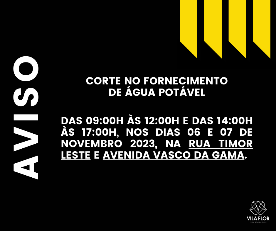 Em virtude da execução de trabalhos na rede de abastecimento de água, será efetuado um corte no fornecimento de água potável em Vila Flor, durante os dias 06 e 07 de Novembro, das 09:00 horas até às 12:00 horas, e das 14:00 horas até às 17:00 horas.