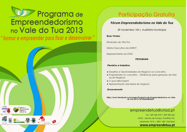 Dia 29 de novembro, pelas 10h00, realizou-se o Fórum Empreender no Vale do Tua, em Vila Flor, que pretendeu apresentar e divulgar a iniciativa, identificar ideias e oportunidades de negócio e captar potenciais interessados na adesão a 2ª Edição do Programa de Empreendedorismo no Vale do Tua.