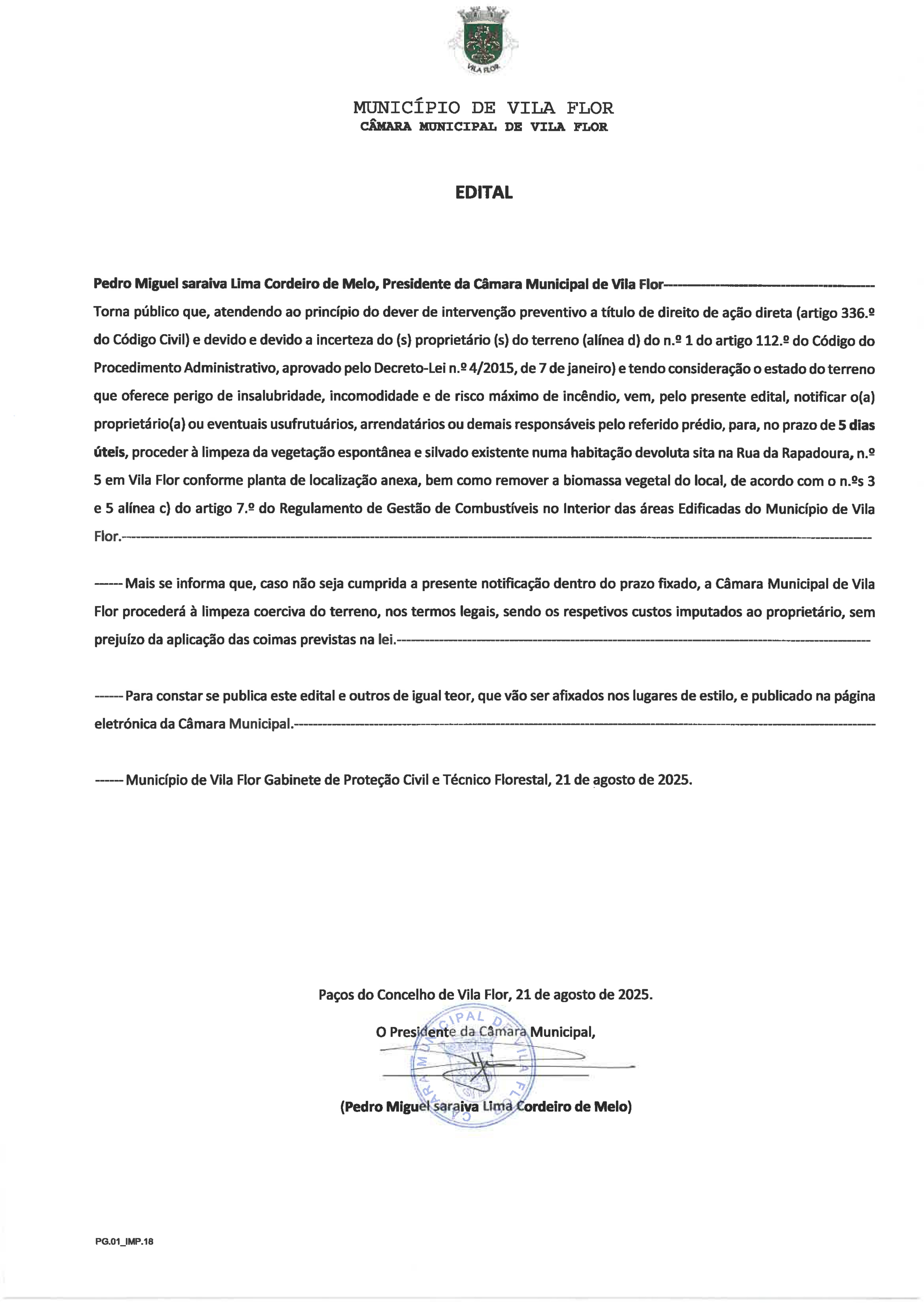 O Presidente do Município torna público que, atendendo ao princípio do dever de intervenção preventivo a título de direito de ação direta (artigo 336.e do Código Civil) e devido e devido à incerteza do (s) proprietário (s) do terreno (alinea d) do n.e 1 do artigo 112.e do Código do Procedimento Administrativo, aprovado pelo Decreto-Lei n.e 4/2015, de 7 de janeiro) e tendo considerado o estado do terreno que oferece perigo de insalubridade, incomodidade e de risco maximo de incêndio, vem, pelo presente edital, notificar o(a) proprietário(a) ou eventuais usufrutuários, arrendatários ou demais responsáveis pelo referido prédio, para, no prazo de 5 dias úteis, proceder à limpeza da vegetação espontânea e silvado existente numa habitação devoluta sita na Rua da Rapadoura, n.5 em Vila Flor conforme planta de localização anexa, bem como remover a biomassa vegetal do local, de acordo com o n.es 3 e 5 alinea c) do artigo 7 do Regulamento de Gestão de Combustíveis no Interior das areas Edificadas.